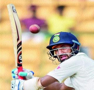 बंगळुरू : चेतेश्वर पुजाराच्या नाबाद ७९ धावांच्या खेळीच्या जोरावर भारताने सोमवारी आॅस्ट्रेलियाविरुद्धच्या दुसऱ्या कसोटी सामन्यात तिसऱ्या दिवसअखेर दुसऱ्या डावात १२६ धावांची आघाडी घेत आशा कायम राखल्या. सोमवारी तिसऱ्या दिवसाचा खेळ थांबला त्या वेळी भारताने दुसऱ्या डावात ४ बाद २१३ धावांची मजल मारली होती. भंगणाऱ्या खेळपट्टीवर भारतीय संघ आता आव्हानात्मक धावसंख्या उभारण्यासाठी प्रयत्नशील आहे. भारताने आॅस्ट्रेलियाचा पहिला डाव २७६ धावांत गुंडाळला. डावखुरा फिरकीपटू रवींद्र जडेजाने ६३ धावांच्या मोबदल्यात ६ बळी घेत आॅस्ट्रेलियाचा डाव गुंडाळण्यात महत्त्वाची भूमिका बजावली.मालिकेत प्रथमच भारताने विकेट न गमावता एक सत्र खेळून काढले. राहुल व पुजाराची जोडी लियोनने फोडली. पहिल्या स्लिपमध्ये तैनात आॅस्ट्रेलियाचा कर्णधार स्टीव्ह स्मिथने अप्रतिम झेल टिपत राहुलची खेळी संपुष्टात आणली. राहुलने अर्धशतकी खेळीदरम्यान कसोटी कारकिर्दीत एक हजार धावांचा पल्ला गाठला. रहाणेने दडपणाखाली आपल्या कारकिर्दीतील महत्त्वाची खेळी केली. भारताची ४ बाद १२० अशी अवस्था असताना पुजाराला साथ देण्यासाठी रहाणे खेळपट्टीवर आला. या जोडीने फटके खेळताना सावधगिरी बाळगली. त्यांनी एकेरी-दुहेरी धावा घेण्यावर भर दिला. या दोघांनी फिरकीपटू नॅथन लियोन (६९ धावांत बळी नाही) आणि स्टीव्ह ओकीफे (२८ धावांत १ बळी) यांचा मारा समर्थपणे खेळून काढला. आॅस्ट्रेलियातर्फे जोश हेजलवुड (३-५७) सर्वाधिक यशस्वी गोलंदाज ठरला. त्याने अभिनव मुकुंद (१६) व रवींद्र जडेजा (२) यांना क्लीन बोल्ड केले. भारतीय कर्णधार विराट कोहली (१५) पुन्हा एकदा अपयशी ठरला. तो वादग्रस्त निर्णयाचा बळी ठरला. मैदानी पंच नायजेल लाँग यांनी चहापानाला पाच षटकांचा अवधी शिल्लक असताना हेजलवुडच्या गोलंदाजीवर त्याला पायचित बाद दिले. कोहलीने चेंडू बॅटला लागल्याचा इशारा करताना डीआरएस घेण्याचा निर्णय घेतला. टीव्ही पंच रिचर्ड केटलबोरोने यांनी चेंडू प्रथम बॅटला लागला की पॅडला हे स्पष्ट होत नसल्याचे सांगताना मैदानावरील पंचांचा निर्णय कायम ठेवला. कोहलीने मैदान सोडताना नाराजी व्यक्त केली. कोहली पहिल्या कसोटी सामन्यात शून्य व १३ धावा काढून बाद झाला होता, तर या कसोटीत पहिल्या डावात १२ धावांवर बाद झाला. त्याआधी, सकाळच्या सत्रात जडेजाने १० चेंडूंमध्ये तीन बळी घेत आॅस्ट्रेलियाच्या तळाच्या फलंदाजांना झटपट माघारी परतवले. भारताने आॅस्ट्रेलियाचा डाव २७६ धावांत गुंडाळला. रविचंद्रन आश्विनने (२-८४) सर्वप्रथम स्टार्कला (२६) माघारी परतवले. त्यानंतर जडेजाने (६-६३) मॅथ्यू वेड (४०), नॅथन लियोन (००) आणि हेजलवुड (०१) यांना बाद केले. फलंदाजीसाठी खडतर असलेल्या या खेळपट्ट