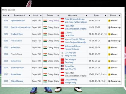 प्रकाश पादुकोण ( १९८०) हे पुरुष एकेरीत आणि सायना नेहवाल ( २०१५) ही महिला एकेरीत जागतिक क्रमवारीत अव्वल स्थानावर होते. त्यानंतर किदंबी श्रीकांतने २०१८ मध्ये अव्वल स्थान पटकावले होते. मुंबईचा चिराग शेट्टी व आंध्रप्रदेशचा सात्विकसाईराज ही पहिली जोडी ज्यांनी हा पराक्रम केला. या जोडीने २०२२ चे वर्ष गाजवले. त्यांनी ऑक्टोबर २०२२ मध्ये फ्रेंच ओपन स्पर्धा जिंकल्यानंतर यंदा मार्चमध्ये स्वीस ओपन स्पर्धा जिंकली. त्यानंतर आशिया अजिंक्यपद स्पर्धा जिंकून इतिहास रचला. भारताला ५८ वर्षानंतर या स्पर्धेत जेतेपद पटकावता आले. १९६५ साली दिनेश खन्ना यांनी सर्वप्रथम ही स्पर्धा जिंकली होती.