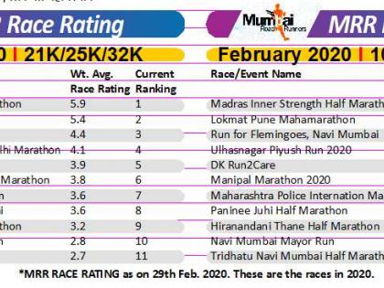 मुंबईतील टाटा मॅरेथॉनने फूल मॅरेथॉन गटात ५.४ रेस रेटिंगसह अव्वल क्रमांक कायम राखण्यात यश मिळविले. १० ते १६ आणि २१ ते ३२ किलामीटर या दोन्ही गटांमध्ये अनुक्रमे ६.३ आणि ५.९ रेस रेटिंगसह मद्रास इनर स्ट्रेंग्थ हाफ मॅरेथॉनने बाजी मारली.