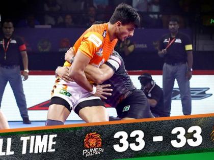 नवी दिल्ली, प्रो कबड्डी : प्रो कबड्डीमध्ये यु मुंबा आणि पुणेरी पलटण यांच्यामध्ये 32चा आकडा असल्याचे सर्वश्रूत आहेच. पण आज झालेल्य सामन्यात मात्र या 33चा आकडा पाहायला मिळाला. आज मुंबई आणि पुण्याचा सामना चांगलाच थरारक झाला. अखेरच्या क्षणापर्यंत कोणता संघ जिंकेल, हे सांगणे कठीण होते. पण अखेर दोन्हीपैकी कोणताच संघ जिंकला नाही. कारण मुंबई आणि पुण्यातील सामना 33-33 या समान गुणांवर बरोबरीत सुटला.