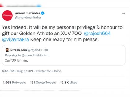 एका ट्विटर युजरनं आनंद महिंद्रा यांना नीरजला Xuv700 गिफ्ट देण्याची मागणी केली. त्यावर महिंद्रा यांनी रिप्लाय दिला अन् त्यांनी त्यांच्या कंपनीतील दोन व्यक्तींना टॅग करून नीरजसाठी Xuv700 गिफ्ट म्हणून तयार करण्यास सांगितले.