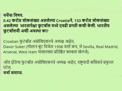 क्रोएशियाच्या या गरुडभरारीनंतर, १ अब्जाहून अधिक लोकसंख्या असलेला आपला भारत फुटबॉलमध्ये पिछाडीवर का, असा प्रश्न अनेकांना पडणं स्वाभाविकच आहे. त्याचं मजेशीर, पण त्यापेक्षाही मार्मिक उत्तर व्हॉट्स अॅपवर व्हायरल झालंय. राजकारणाचा खेळ आणि खेळाचं राजकारण झाल्यानंच आपल्याकडे सगळ्या खेळांचा खेळखंडोबा झाला आहे, असं खेदजनक वास्तव या मेसेजमधून पुन्हा समोर आलंय.