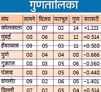 दुसरीकडे गुजरातला पुढील सहापैकी पाच सामन्यांत विजय संपादन करावा लागणार आहे. ड्वेन ब्राव्होच्या दुखापतीचा गुजरातला फटका बसला आहे. मात्र जेम्स फॉकनर व अॅँड्र्यू टाये याने गोलंदाजीत विविधता दाखवली आहे. फलंदाजीत मॅकूलम व अॅरॉन फिंचने प्रभावी कामगिरी केली आहे. यॉर्करचा प्रभावी मारा करणारा बासिल थम्पीने सर्वांचेच लक्ष वेधून घेतले आहे. मधल्या फळीत दिनेश कार्तिकनेही चमकदार कामगिरी केली आहे.