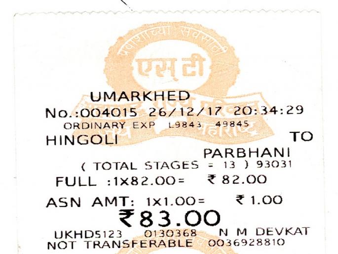 शहा नगर भागातील रहिवाशी शेख मुनीर शेख कालू हे बुधवारी सकाळी हिंगोली येथून उमरखेड-अहमदनगर या एमएच डीटी-४३६२ क्रमांकाच्या बसने सकाळी ९़४० वाजता परभणीला येण्यासाठी बसमध्ये बसले़ यावेळी या बसमधील वाहकाने त्यांच्याकडून ८३ रुपये घेऊन परभणीचे तिकीट दिले़ शेख मुनीर यांनी प्रारंभी घाईत ते तिकीट खिशात ठेवले़ थोड्यावेळानंतर त्यांनी तिकीटाची पाहणी केली असता, त्या तिकीटावर २६ डिसेंबर २०१७ अशी तारीख व तिकीट काढल्याची वेळ रात्री ८ वाजून ३४ मिनिट २९ सेकंदाची नमूद असल्याचे दिसून आले़ शिवाय तिकीटावरील बसचा क्रमांक एल ९८४३ होता़ त्यामुळे त्यांना हे जुने तिकीट असल्याचे लक्षात आले़ त्यांनी इतर प्रवाशांकडे चौकशी केली असता त्यांना बरोबर तिकीट होते़