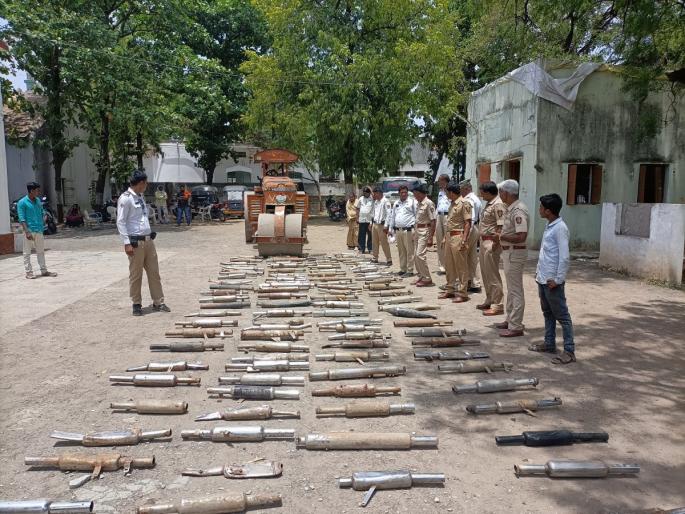 शहर वाहतूक शाखेच्या पोलीस मुख्यालयातील प्रांगणामध्ये शनिवारी दुपारी उपविभागीय पोलीस अधिकारी राजेंद्र शिरतोडे, वाहतूक शाखेचे सहाय्यक पोलीस निरीक्षक सचिन इंगेवाड, पोलीस उपनिरीक्षक मकसूद पठाण, रवींद्रनाथ दीपक यांच्यासह १० ते १५ कर्मचाऱ्यांच्या उपस्थितीत ही मोहीम राबविण्यात आली. दोन वर्षात शहरात विविध ठिकाणी कारवाई करून जप्त केलेले साडेचारशे सायलेन्सर शहर वाहतूक शाखेच्या पोलीस मुख्यालयातील एका खोलीत जमा करण्यात आले होते. एका सायलेन्सरची किंमत अंदाजे तीन हजार एवढी होती. पोलीस अधीक्षक रागसुधा आर. यांच्या आदेशान्वये प्राप्त सूचनेनुसार ही मोहीम राबविण्यात आली.