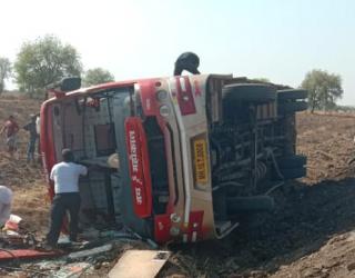 मातीचा भराव खचल्याने खाजगी बस उलटून नऊ यात्रेकरू जखमी