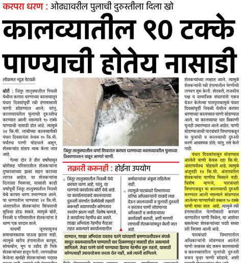 लोकमत न्यूज नेटवर्कबोरी (परभणी): शेतीसाठी करपरा धरणातून सोडण्यात आलेले पाणी पुलावरील नादुरुस्तीमुळे वाया जात असल्याचे वृत्त ‘लोकमत’ने प्रसिद्ध केल्यानंतर पाटबंधारे विभागाने या कालव्याचे पाणी बंद केले आहे़करपरा धरणातील पाणी शेतकऱ्यांना रबी हंगामासाठी वापरता यावे, यासाठी कालव्याद्वारे सोडण्यात आले होते; परंतु, कालव्यावर असलेल्या पुलांची पाटबंधारे विभागाने दुरुस्ती केली नव्हती़ त्यामुळे १५ दिवसांपूर्वी पाणी सोडूनही २४ किमी पैकी केवळ १० किमी पर्यंतच पाणी पोहचले़ त्यामुळे शेतकºयांना नाहक मानसिक त्रास सहन करावा लागला़ याबाबत ‘लोकमत’ने १२ नोव्हेंबर रोजीच्या अंकात ‘९० टक्के पाण्याची नासाडी’ या मथळ्याखाली वृत्त प्रकाशित केले होते़ या वृत्ताची दखल घेत पाटबंधारे उपविभागाचे अभियंता बी़बी़ तोटावार यांनी कालव्याला सोडण्यात आलेले पाणी तत्काळ बंद करण्याचे आदेश दिले आहेत़ त्यामुळे आता पुलांची दुरुस्ती होवून शेतकºयांना चार ते पाच दिवसानंतर पाणी मिळणार आहे़ त्यामुळे शेतकºयांनी सहकार्य करावे, असे आवाहन बी़बी़ तोटावार यांनी केले आहे़विशेष म्हणजे दुष्काळी परिस्थिती असल्याने मंत्रालयापासून ते तहसील कार्यालयापर्यंत पाणी प्रश्नावर तातडीच्या बैठका घेऊन नियोजन केले जात आहे़; परंतु, उपलब्ध पाण्याची नासाडी झाल्यामुळे करपरा धरणाच्या कालव्यावरील लाभक्षेत्रातील शेतकºयांमध्ये तीव्र संताप व्यक्त होत आहे़ या पुढे पाण्याचे योग्य नियोजन करावे, अशी मागणी शेतकºयांमधून होत आहे़‘दोषींवर कार्यवाही करा’४कालव्यावरील पुलांची दुरुस्ती न करताच करपरा धरणातील पाणी सोडण्यात आले़ त्यामुळे जिंतूर तालुक्यातील निवळी ते वर्णा दरम्यान असलेल्या चार पुलांवरून ९० टक्के पाण्याची नासाडी झाली़ दुष्काळी परिस्थितीत पाण्याची नासाडी करणाºया शाखा अभियंत्यांवर कार्यवाही करावी, अशी मागणी होत आहे़