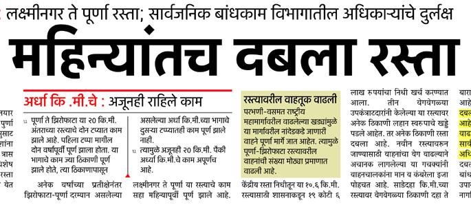 सहा महिन्यांपूर्वी पूर्ण झालेला लक्ष्मीनगर ते पूर्णा हा रस्ता जागोजागी दबला होता. दबलेल्या रस्त्यामुळे सुसाट वेगात असलेल्या वाहनातील प्रवाशांना गचक्यांचा त्रास सहन करावा लागत होता. विशेष बाब म्हणजे, या रस्त्यावरील नव्याने बांधकाम केलेल्या नळकांडी पुलावर अधिक रस्ता दबला होता. केंद्रीय रस्ते निधीतून या रस्त्याच्या १०.६ कि.मी. कामासाठी शासनाकडून १९ कोटी ६ लाख रुपयांचा निधी खर्च करण्यात आला आहे. मात्र या रस्त्यावर अनेक ठिकाणी लहान स्वरुपाची खड्डे होते. तसेच अनेक भागात रस्ता दबला होता.