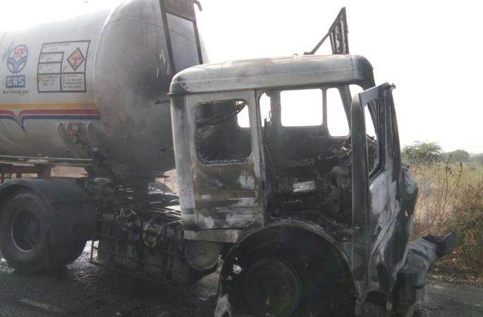 1 / 4अपघातानंतर गॅसने भरलेल्या टॅँकरने पेट घेतला.2 / 4या आगीत टॅँकरची कॅबिन पूर्ण जळाली. सुदैवाने ही आग गॅसपर्यंत पोहचली नाही. अन्यथा मोठी दुर्घटना घडली असती.3 / 4बाळापूर नगरपालिका व अकोला महानगर पालिकेच्या अग्निशमन बंबांनी घटनास्थळावर धाव घेऊन आग विझवली.4 / 4अपघातामुळे महामार्गावरील वाहतूक विस्कळीत झाली होती. पोलिसांनी महामार्गावरील वाहतूक बाळापूर शहरातून वळवली होती.