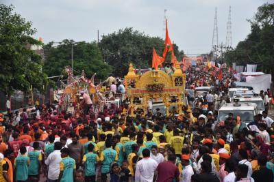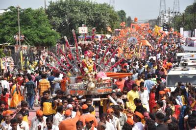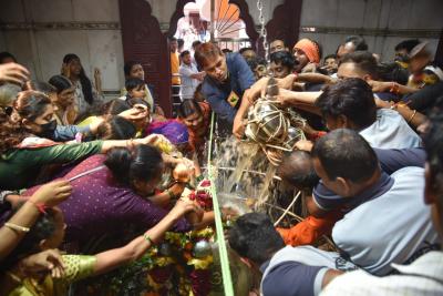अकोला - ग्रामदैवत श्री राज राजेश्वरास जलाभिषेक करण्यासाठी हरिहरेश्वर येथून पूर्णा नदीतील पवित्र जल घेऊन लाखो कावडधारक अकोला शहरात दाखल झाले. मिरवणुकीने ढोल ताशाच्या गजरात 'हर बोला महादेव'चा गजर करीत ते मंदिराकडे मार्गस्थ झाली.