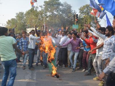 संतप्त अनुयायांनी दुपारी अशोक वाटिका चौकात पंतप्रधान नरेंद्र मोदी यांच्या प्रतीकात्मक पुतळय़ाचे दहन करून आपल्या रोष व्यक्त केला.