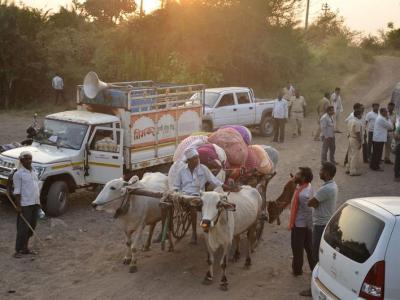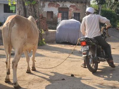 सहा दिवसांपासून खुंटाला बांधलेला बैल दुचाकीला बांधून चारण्यासाठी नेताना शेतकरी. निदान दुचाकीच्या आवाजाला वाघ घाबरेल, ही भाबडी आशा त्याला आहे.
