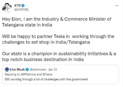 तेलंगणाचे उद्योग आणि वाणिज्य मंत्री केटी रामाराव यांनी मस्क यांच्या ट्वीटला उत्तर दिलं. "मी भारतातील तेलंगणा राज्याचा उद्योग मंत्री आहे. भारतात / तेलंगणात प्रकल्प उभारण्यात येणारी आव्हानं दूर करण्यास मदत करताना आम्हाला आनंद होईल. राज्य अनेक शाश्वत उपक्रमांमध्ये चॅम्पियन आहे आणि भारतातील एक उत्तम बिझनेस डेस्टिनेशन आहे," असं ट्वीट त्यांनी केलंय.