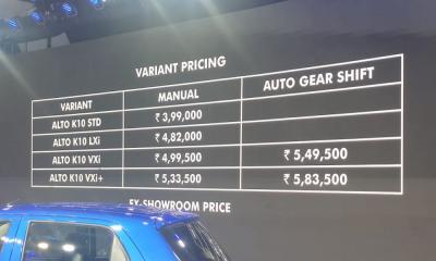 नवीन मारुती अल्टो K10 ची सुरुवातीची किंमत 3.99 लाख रुपये (एक्स-शोरूम) असेल, तर टॉप व्हेरिएंटची किंमत 5.83 लाख रुपये असेल. ह्यामध्ये ऑटोमॅटिक गिअरबॉक्सदेखील मिळेल. कंपनीने ही कार एकूण चार व्हेरिअंटमध्ये सादर केली आहे. याशिवाय Alto K10 LXi 4,82,000 रुपये एक्स शोरूम, Alto K10 VXi ची किंमत 4,99,500 एक्स शोरूम आणि ऑटो व्हेरिअंटची किंमत 5,49,500 रूपये एक्स शोरूम, Alto K10 VXi 5,33,500 रूपये आणि ऑटो व्हेरिअंटची किंमत 5,83,500 रूपये एक्स शोरूम इतकी निश्चित करण्यात आलीये.