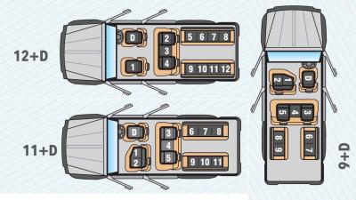 म्हणजेच मागच्या बाजूला एकूण ८ लोक बसतात. अशा प्रकारे एकूण १३ लोकांसाठी बसण्याची सोय आहे. दुसरीकडे, १०-सीटर कॉन्फिगरेशनमध्ये, पुढच्या बाजूला ड्रायव्हरसह दोन प्रवासी जागा आहेत. दुसऱ्या रांगेत तीन पॅसेंजर (बेंच सीट) सीट्स आणि मागील बाजूस दोन फ्रंट-टू- बॅंच सीट आहेत ज्यात ४ लोक बसू शकतात.