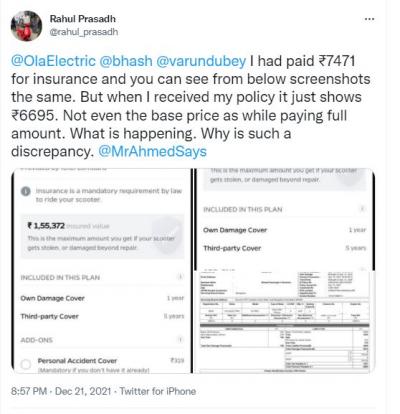 ओला इलेक्ट्रीक सुरुवातीपासूनच ग्राहकांना उत्तर देण्यास कुचराई करते. याचा अनुभव स्कूटर बुकिंग करताना अनेकांना आला आहे. दुसरा मुद्दा इन्शुरन्सचा एका ग्राहकाने उचलला आहे.