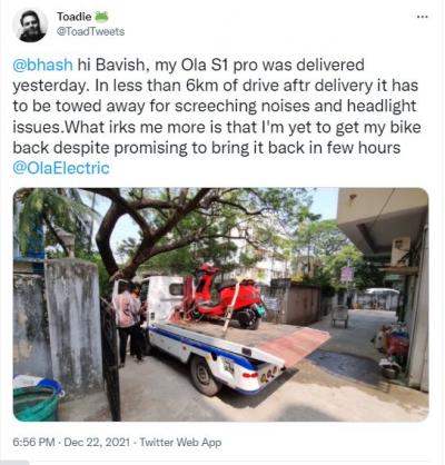 टोडी नावाच्या ग्राहकाने तर ओला स्कूटरची पोलखोल केली आहे. आदल्या दिवशी त्याला स्कूटरची डिलिव्हरी मिळाली, दुसऱ्या दिवशी सहा किमी नाही चालविली तेवढ्यात त्या स्कूटरमधून विचित्र आवाज येऊ लागले. हेडलाईटमध्ये देखील समस्या होती. ही स्कूटर अखेर टो करून न्यावी लागली. काही तासांत देतो असे सांगतिले परंतू दिवस संपला तरी त्याला काही कळविण्यात आले नाही.