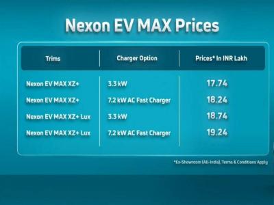 नव्या Tata Nexon EV Max कारचे दोन सेगमेंट कंपनीनं बाजारात आणले आहेत. यात XZ+ आणि XZ+ Lux अशा दोन प्रकारात कार उपलब्ध करुन देण्यात आळी आहे. तसंच यात चार्जिंगचे दोन पर्याय देखील उपलब्ध असणार आहेत. टाटा नेक्सॉन ईव्ही मॅक्सची किंमत १७.७४ लाखांपासून सुरू होते तर टॉप मॉडेलची किंमत १९.२४ लाख रुपये इतकी आहे.