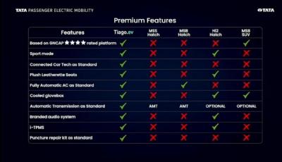 कंपनीनं नव्या टियागो ईव्ही कारमध्ये अनेक फिचर्स ऑफर केले आहेत. यात 24kWh चा बॅटरी पॅक दिला आहे. जो एकदा फूल चार्ज झाला की कार ३१५ किमीची रेंज देण्यास सक्षम आहे. तसंच 19.2kWh बॅटरीचाही पर्याय कंपनीनं उपलब्ध करुन दिला आहे. यात कार फूल चार्ज झाली की २५० किमीची रेंज देण्याची क्षमता आहे. कंपनीनं कारमध्ये इलेक्ट्रिक मोटर आणि फ्रंट-व्हील ड्राइव्ह सेटअप दिला आहे. जे आपण याआधीच्या टिगोर इव्हीमध्येही पाहिले आहेत.