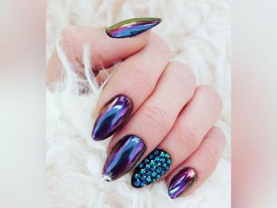दोन रंगातील हे वेगवेगळे नेल पॉलिशचे डिझाईन असून यावर दागिनेही चढविण्यात आली आहेत.