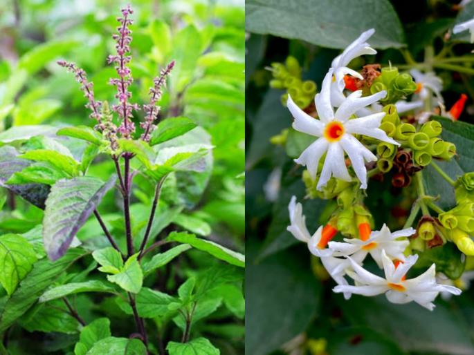 1 / 7ज्या घरात, दारात तुळशीचे रोप फोफावले असते, बहरले असते, असे घर म्हणजे प्रत्यक्ष तीर्थच आहे. अशा घरात यमाचे दूत म्हणजे रोग, रोगजंतू येत नाहीत. तुळशीचा गंध वाऱ्याने जिथपर्यंत जोतो, तिथपर्यंतच्या दाही दिशातील प्रदेश शुद्ध होतो. रोगजंतुरहित होतो. तुळशीच्या आसपासची दोन मैलांची जागा गंगाजलाइतकी शुद्ध व पावन होते. हे वैज्ञानिकदृष्ट्या सिद्ध झाले आहे. म्हणून इतर कोणतेही रोप असो वा नसो, घरात किंवा दारात तुळस हवीच. तिला मध्यम सूर्यप्रकाश आणि पुरेसे पाणी लागते. थोडीफार मशागत केली की तुळस छान वाढते.2 / 7वास्तुशास्त्रानुसार घराभोवती किंवा अंगणात, खिडकीत विविध प्रकारची रोपे लावली, तर ती पाहून मन प्रसन्न राहते. त्याचप्रमाणे स्वयंपाकघरात, बैठकीच्या खोलीत, दिवाण खान्यात सूर्यप्रकाशाशिवाय टिकतील अशी रोपे लावण्यास सांगितले जाते. तो छोटासा कोपरा घरातील नकारात्मक ऊर्जा शोषून घेतो. याच पार्श्वभूमीवर फेंगशुईच्या माध्यमातून मनी प्लांट भारतीय अंगणात रुजू लागले. डोळ्यांना आल्हाददायक वाटते. त्याला जास्त सूर्यप्रकाश लागत नाही. घरात बाहेर कुठेही ठेवू शकता मोठी कुंडीच हवी असे नाही. छोट्या बरणीत, बाटलीतही ते आकार घेते.3 / 7नागवेलीचे पान अर्थात विड्याचे पान. त्याला धार्मिक कार्यात आणि आयुर्वेदात अतिशय महत्त्व आहे. सुपारी, चुना, कात, हिरवी पत्ती घालून केलेला विडा, दोन्ही जेवणानंतर खावा. हा उत्तम बलवर्धक आहे. परंतु त्याचे अति सेवन वाईट! ही पाने उष्ण असल्याने सर्दी, खोकला, ताप यावर गुणकारी असतात. त्याची वेल फार सुंदर दिसते. या वेलीला फार सूर्यप्रकाश लागत नाही. घरातही पुरेसा सूर्यप्रकाश मिळेल अशा जागी नागवेलीचे रोप लावावे. वेलीला काठीचा आधार देत राहावा. बाकी फार मशागत करावी लागत नाही. त्याची वाढ भरभर होते. ते जितक्या वेळा खुडले जाते तेवढ्या वेळा ते जास्त वाढते.4 / 7पारिजात ही भारतात उगवणारी एक औषधी झाड आहे. ह्याच्या फुलांचा सुगंध मनमोहक आहे. पारिजातकाचे झाड स्वर्गातून कृष्णाने पृथ्वीवर आणले. याचा गंध जेवढ्या दूर पसरतो, तेवढा परिसर सुगंधाने व्यापलेला असतो. तिथले वातावरण प्रसन्न राहते. साध्या मातीत पण ते पटकन रुजते. परंतु त्याला पुरेसा सूर्यप्रकाश मिळायला हवा. मग टपोऱ्या सुगंधी फुलांची बरसात व्हायला वेळ लागत नाही.5 / 7तुमच्या घराला मोठी बाल्कनी असेल तर घरच्या घरीच केळ्याचे रोप लावू शकता. तसे शक्य नसेल, तर आपल्या इमारतीच्या आवारात आवर्जून केळ्याचे रोप लावा. ते अतिशय आल्हाद दायक दिसते. ते लवकर रुजते. केळीच्या पानाचा वापर सर्वांना करता येतो. हिंदू धर्मात केळीच्या खांबांना म्हणजे झाडाच्या खोडाला, आंब्याच्या पानांच्या तोरणाप्रमाणेच शुभसूचक, मांगल्याचे प्रतीक मानले जाते. लग्न, मुंज अशा श