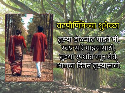 तुझ्या डोळ्यात पाहते मी, स्वप्न सारे माझ्यासाठी, तुझ्या स्पर्शात रमून घेते, आजचा दिवस तुझ्यासाठी! साता जन्माच्या सोबतीसाठी वटपौर्णिमेच्या शुभेच्छा!