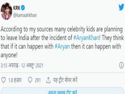 अभिनेता कमाल आर. खाननं याबद्दल एक ट्विट केलं आहे. आर्यन खान प्रकरणानंतर बरेच स्टार किड्स भारत सोडण्याच्या तयारीत असल्याची माहिती सुत्रांनी दिल्याचं केआरकेनं ट्विटमध्ये म्हटलं आहे. आर्यनसोबत असं घडू शकतं, तर मग कोणासोबतही घडू शकतं, अशी भावना त्यांच्या मनात आहे, असं केआरकेनं ट्विटमध्ये पुढे नमूद केलं आहे.