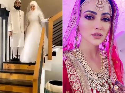सनाच्या लग्नातील एक व्हिडीओ व्हायरल झाला होता. ज्यात ती आपल्या पतीचा हात पकडून शिड्यांनी खाली उतरताना दिसते आहे आणि नंतर लग्नाचा केक कापताना दिसली.(फोटो: इंस्टाग्राम)