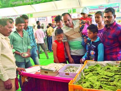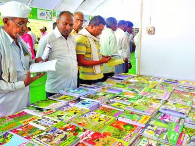 कृषी महोत्सवात कृषी विषयावरील विविध पुस्तकांचे अवलोकन करताना शेतकरी.