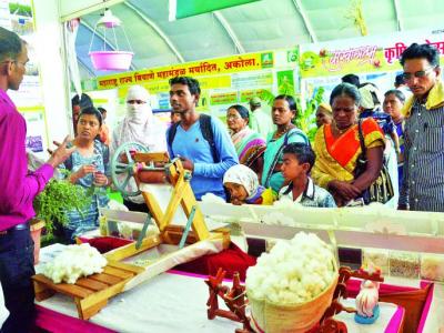 कापूस ते कापड विषयाशी संबंधित सूतकताई यंत्राची माहिती घेताना विद्यार्थी, महिला.