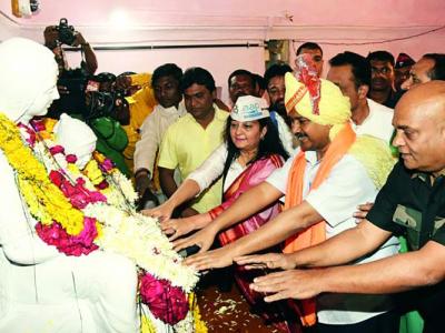 राष्ट्रमाता जिजाऊंना अभिवादन करताना दिल्लीचे मुख्यमंत्री अरविंद केजरीवाल, आपच्या कीर्ती मेमन, ब्रिगेडिअर सुधीर सावंत व अन्य.