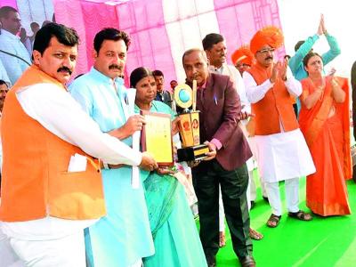 जिजाऊ सृष्टीवर संभाजीराजे भोसले यांच्या हस्ते पुरस्कार स्वीकारताना लेफ्टनंट स्वाती महाडीक यांचे कुटुंबीय.