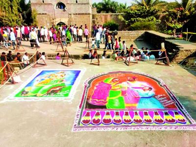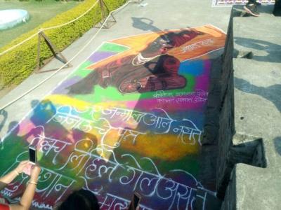 जिजाऊ जन्मोउत्सवानिमित्त राजवाडा परिसरात जिजाऊ भक्तांनी रेखाटलेली रांगोळी.