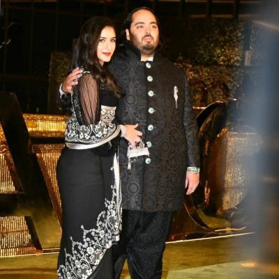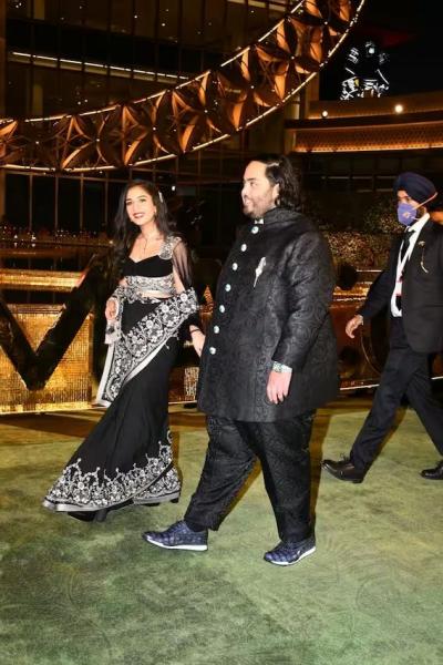 राधिकाने ब्लॅक कलरची साडी परिधान केली होती, त्यामध्ये तिचं सौंदर्य अधिकच खुललं होतं. तर, अनंत अंबानी यांनीही काळ्याच रंगाचा जोधपुरी परिधान केला होता.