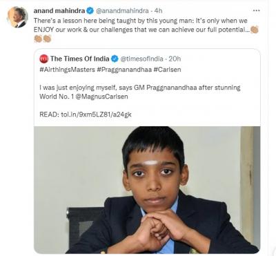 सोशल मीडियावर सक्रीय असलेले आणि अलौकिक कामगिरी करणाऱ्यांना थेट कार भेट देणारे उद्योगपती आनंद महिंद्र यांनीही प्रग्यानंदचं कौतूक केलंय.