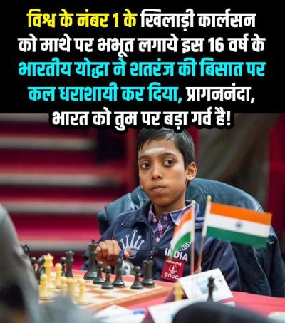 भारताचा १६ वर्षांचा बुद्धिबळपटू आणि युवा ग्रँडमास्टर आर. प्रग्यानंद याने मोठी कामगिरी करून दाखवली. भारतीय ग्रँडमास्टरने जागतिक क्रमवारीत अव्वल क्रमांकावर असलेल्या 'वर्ल्ड चॅम्पियन' बुद्धिबळ मास्टर मॅग्नस कार्लसनचा पराभव केला आहे.
