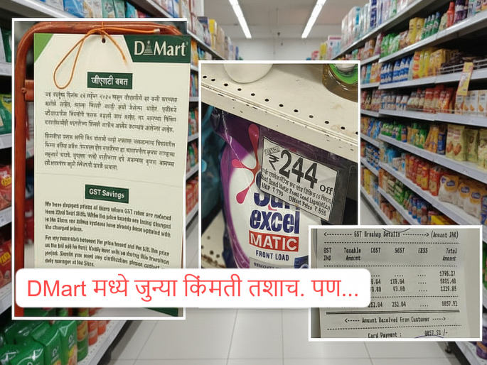 1 / 8आजपासून जीएसटीचे दर कमी झाले आहेत. वाहनांपासून ते इलेक्ट्रॉनिक्स वस्तू, खाद्यपदार्थ, दैनंदिन गरजेच्या वस्तूंच्या किंमती मोठ्या प्रमाणावर कमी झाल्या आहेत. अशातच डीमार्ट सारख्या ठिकाणी आज बरीच कमी प्रमाणावर गर्दी पहायला मिळाली. पहिल्याच दिवशी डीमार्टने जीएसटी कमी केलेला का? दैनंदिन वस्तूंवर किती जीएसटी लागला? हे समोर आले आहे.2 / 8डीमार्टमध्ये एक सूचना लिहिलेली होती. डीमार्टमध्ये अनेक वस्तू असतात, यामुळे प्रत्येक वस्तूची नवीन किंमत एका रात्रीत बदलणे, त्यावर प्रिंट करणे कोणालाच शक्य नव्हते. यामुळे वस्तूंवर डीमार्ट प्राईज जुनीच होती. तसेच रॅकवर जो डीमार्टचा डिस्काऊंटचा छापील टॅग असतो तो देखील तसाच होता.3 / 8परंतू, या सुचनेनुसार हे फलक बदलले जात होते. बिलिंग प्रणालीमध्येही नवीन कमी झालेल्या किंमती आधीच अपडेट केल्या गेल्या आहेत. वस्तूंवरील किंमत, डिस्काऊंट किंमत यापेक्षा बिलावरील किंमत कमी झालेली असणार आहे, असे त्यात म्हटले होते. 4 / 8पुण्यात एका ग्राहकाने डीमार्टमध्ये जवळपास ८,८५७ रुपयांची खरेदी केली. बिलामध्ये डाळी, कडधान्ये, दूध, पोहे, मीठ आदी गोष्टी शून्य टक्के जीएसटीमध्येच आल्या आहेत. 5 / 8तर तूप, बटर, श्रीखंड, पॅकेज्ड कडधान्ये जसे की मूंग, चवळी, वाटाना आदी हे ५ टक्के जीएसटी मध्ये आले आहेत. चहा पावडर, मसाला, तेल, साखर, बिस्कीटे, टोस्ट, टूथपेस्ट व इतर गोष्टी या देखील ५ टक्के जीएसटीमध्ये आल्या आहेत. 6 / 8तर कपड्याचा, अंघोळीचा, भांड्या साबणासह सौंदर्य प्रसाधणाच्या वस्तू या १८ टक्के जीएसटीमध्ये आल्या आहेत. एकूण ८३९२.२४ रुपयांच्या बिलावर केंद्राचा जीएसटी २३२.६४ आणि राज्याचा जीएसटी २३२.६४ असा मिळून ४६५.२८ एवढा जीएसटी लागला आहे. 7 / 8हे एकूण बिल ८८५७.५२ रुपयांचे झाले असून या एकूण ७८ वस्तूंच्या एमआरपीवर ३३०३.६३ रुपये वाचल्याचे या बिलावर म्हटले आहे. एकूण बिलापैकी १७९६.२७ एवढी रक्कम शून्य जीएसटीमध्ये आली आहे. 8 / 8एकंदरीतच बिल तपासल्यावर सर्व वस्तू या त्या त्या जीएसटी स्लॅबमध्ये आढळल्या आहेत. अनेक वस्तूंवर जुनीच किंमत आहे, परंतू बिलावर जीएसटी कपात झालेली आहे. ग्राहकांचा गोधळ उडू नये म्हणून स्पीकरवरून अनाऊंसमेंटही करण्यात येत आहे.