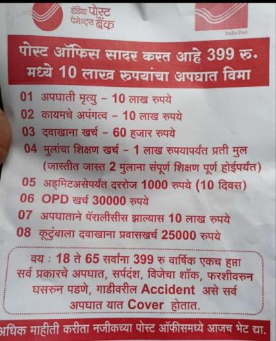भारतीय डाक विभागाच्या एका योजनेनुसार अवघ्या 299 आणि 399 च्या वार्षिक हप्त्यामध्ये (Yearly installments) विमाधारकास (Policy Holder) 10 लाख रुपयांपर्यंत विमा संरक्षण मिळणार आहे.