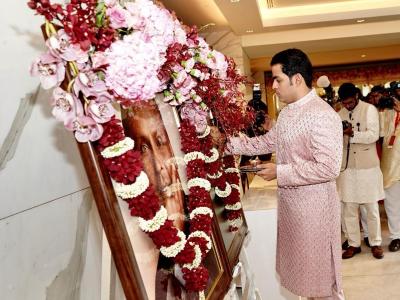 जिओ सेंटरमध्ये पोहोचल्यानंतर आकाश अंबानी यांनी आजोबा धीरूभाई अंबानींच्या फोटोचे दर्शन घेतले.