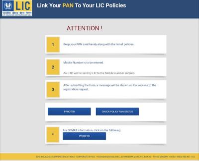 ग्राहकांना एलआयसी इंडियाच्या वेबसाइट- linkpan.licindia.in/UIDSedingWebApp/getPolicyPANStatus वर भेट देऊन त्यांच्या पॉलिसी क्रमांकासह पॅन लिंक करावे लागेल. तुम्ही तुमची LIC पॉलिसी ऑनलाइन पद्धतीनं घरबसल्या पॅन कार्डाशी ऑनलाइन लिंक करू शकता.