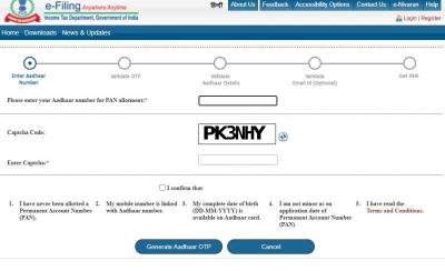 नवं पेज ओपन झाल्यानंतर Get New PAN या पर्यायावर क्लिक करा. नवीन पेजवर आधार कार्ड क्रमांक विचारण्यात येईल. तिथे आपला आधार क्रमांक टाका. कन्फर्म सेक्शनवर क्लिक करून सबमिटवर क्लिक करा. आपल्या रजिस्टर मोबाईल नंबरवर एक OTP पाठवण्यात येईल.