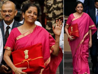 २०१९ साली आपल्या पहिल्याच बजेटमध्ये निर्मला सीतारामन यांनी गडद गुलाबी रंगाच्या साडीला प्राधान्य दिलं होतं. या साडीला देखील सोनेरी रंगाची किनार होती.
