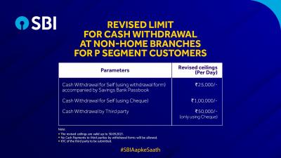 आता ग्राहकांना नॉन-होम ब्रान्चमध्ये जाऊन चेकद्वारे एका दिवसाला केवळ १ लाख रूपयांपर्यंतचीच रोख रक्कम काढता येणार आहे. एसबीआयनं ट्वीटद्वारे यासंदर्भातील माहिती दिली आहे.