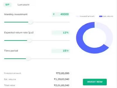 एसआयपी कॅल्क्युलेटरच्या मदतीनं १५ वर्षांत २ कोटी रुपयांचा निधी तयार करण्यासाठी तुम्हाला किती गुंतवणूक करावी लागेल ते समजून घेऊ. २ कोटींचे टार्गेट घेऊ आणि १५ वर्षात टार्गेट पूर्ण करायचं असेल तर दर महिन्याला ४० हजार रुपये गुंतवावे लागतील. यावर अंदाजे १२ टक्के परतावा गृहित धरल्यास तुम्हाला त्या कालावधीत २,०१,८३,०४० रुपये मिळतील. या दरम्यान तुमची गुंतवणूक ७२ लाख रुपये असेल.