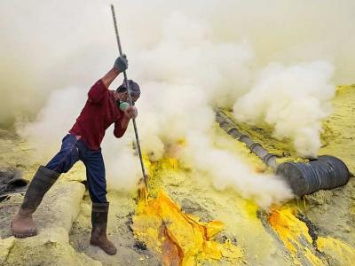 सल्फरची खाण : इंडोनेशियातील प्रसिद्ध नोकरींपैकी एक; सल्फरमुळे फुफ्फुस निकामी होते. तसेच श्वासनलिकेला जखमा होण्याचा धोका