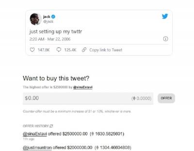यापूर्वी या ट्विटसाठी अन्य एका व्यक्तीने 14.6 कोटी रुपयांची बोली लावली होती. जॅक डोर्सीचे पहिले ट्विट खरेदी करणे म्हणजे खरेदीदाराजवळ त्या ट्विटचे डिजिटल सर्टिफिकेट असेल.