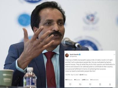 इस्रो प्रमुख एस सोमनाथ यांची सॅलरी किती? - नवभारत टाइम्सने दिलेल्या वृत्तानुसार, 7 व्या वेतन आयोगाप्रमाणे, इस्रोच्या प्रमुखाची मासिक सॅलरी अडीच लाख रुपये महिना एवढी असते. महत्वाचे म्हणजे, इस्रो प्रमुखांना सॅलरी शिवाय राहण्यासाठी घर आणि वाहन आदिंची सुविधाही मिळते. एवढेच नाही, तर इस्रो प्रमुखांना एका आयएएस अथवा आयपीएसचा दर्जाही असतो. इस्रो प्रमुखांच्या सॅलरीसंदर्भात आरपीजी एंटरप्रायजेसचे चेअरमन हर्ष गोयनका यांनी एक ट्विट देखील केले आहे.