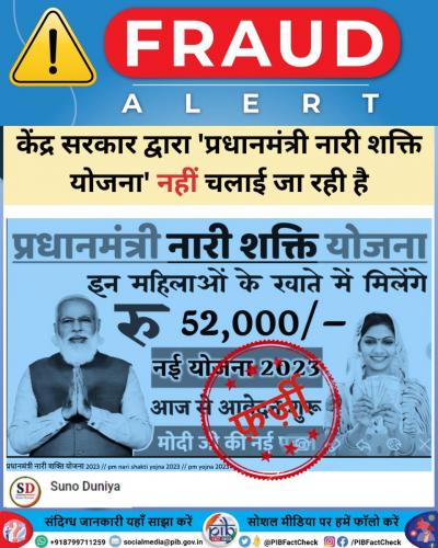 पीआयबीने आपल्या अधिकृत ट्विटमध्ये या योजनेचा खुलासा केला आहे. 'सुनो दुनिया' नावाच्या #YouTube चॅनेलच्या व्हिडीओमध्ये केंद्र सरकार 'प्रधानमंत्री नारी शक्ती योजने' अंतर्गत सर्व महिलांना ५२,००० ची रोख रक्कम देत असल्याचा दावा केला जात आहे.