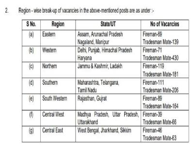 ट्रेड्समन पदासाठी 1249 जागा रिक्त आहेत, तर फायरमन जागेसाठी 544 जागा रिक्त आहेत. एकुण जागा 1793 इतक्या रिक्त जागा आहेत.