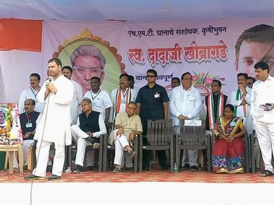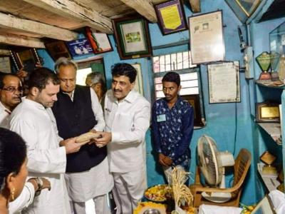 दादाजी खोब्रागडे यांच्या निवासस्थानी तांदळाच्या वाणाची माहिती घेताना राहुल गांधी.